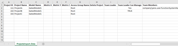 • Metadata Fields - Each metadata field is in a separate column. Enter Yes, Y, True, or 1 for metadata fields that are either on or off, such as VisibleToReports. See Allowed Project Metadata for a list of allowed metadata.
