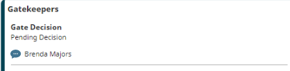 • Gatekeepers - Provides a place for various gate-specific information to be displayed. Gate owners can manage and update gatekeeper assignments as necessary from this pod. Additionally, gatekeepers can vote on gate decisions if gate voting is enabled, and can add or update comments regarding gate decisions. Gatekeeper votes and comments display as read only for others on the team. If gatekeeper skipping is allowed for the gate, gate owners can skip any gatekeeper vote decision. See Voting on Gate Decisions for more information.